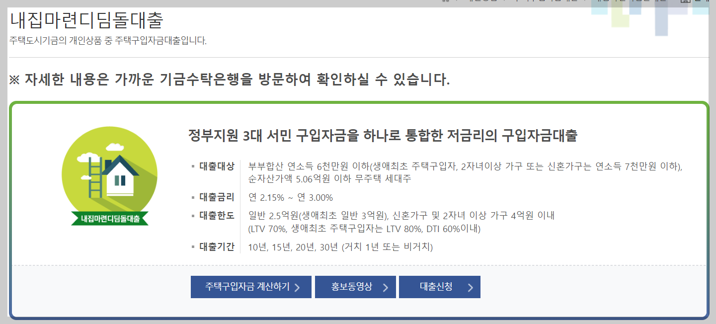 내집마련디딤돌대출은 정부지원 3대 서민 구입자금을 하나로 통합한 저금리 구입자금대출입니다. 세대주를 포함하여 세대원 전원이 무주택자인 경우에 대출을 할 수 있는 상품입니다.