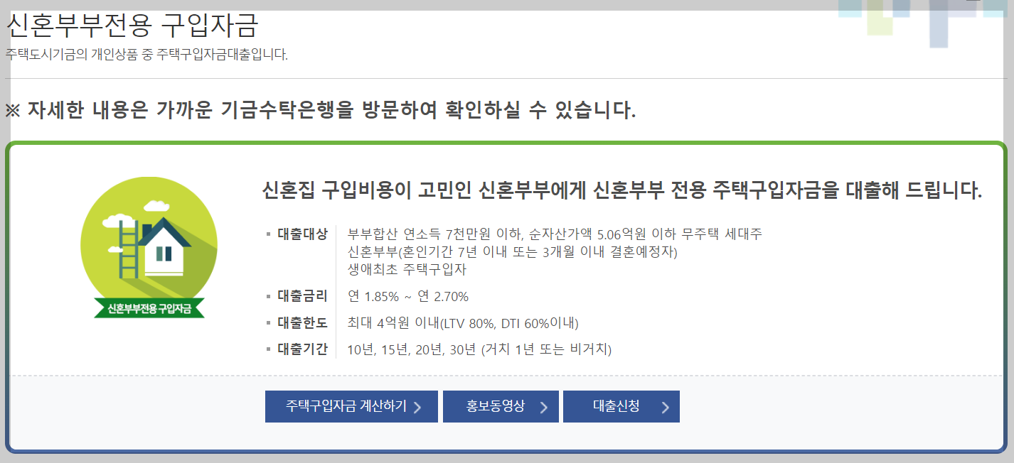 신혼부부전용 구입자금은 생애 최초 주택구입 신혼부부에게 대출을 해주는 제도입니다. 혼인기간이 7년 이내여야 하며 3개월 이내 결혼 예정 부부인 경우 가능합니다.