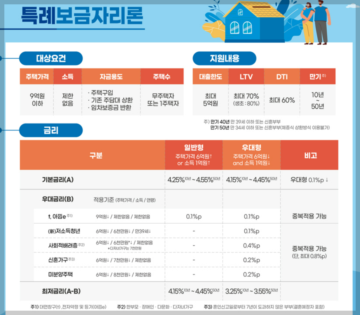 특례보금자리론은 집 값이 9억 원 이하라면 소득에 상관 없이 최대 5억 원까지 대출을 받을 수 있는 특례 대출 정책입니다.